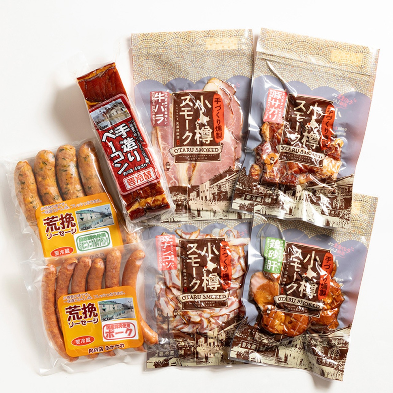ベーコン(300g)、ポークソーセージ(140g)、行者ニンニクフランク(240g)、鶏砂肝スモーク(120g)、ナンコツスモーク(130g)、牛バラスモーク(100g)、豚サガリモーク(120g)