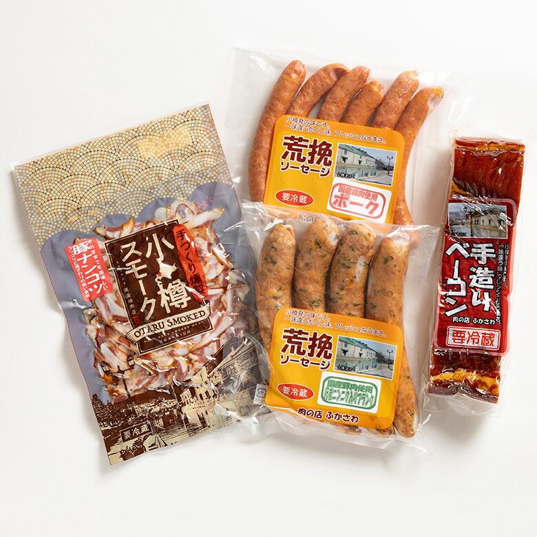 ベーコン(300g)、ポークソーセージ(140g)、行者ニンニクフランク(240g)、ナンコツスモーク(130g)