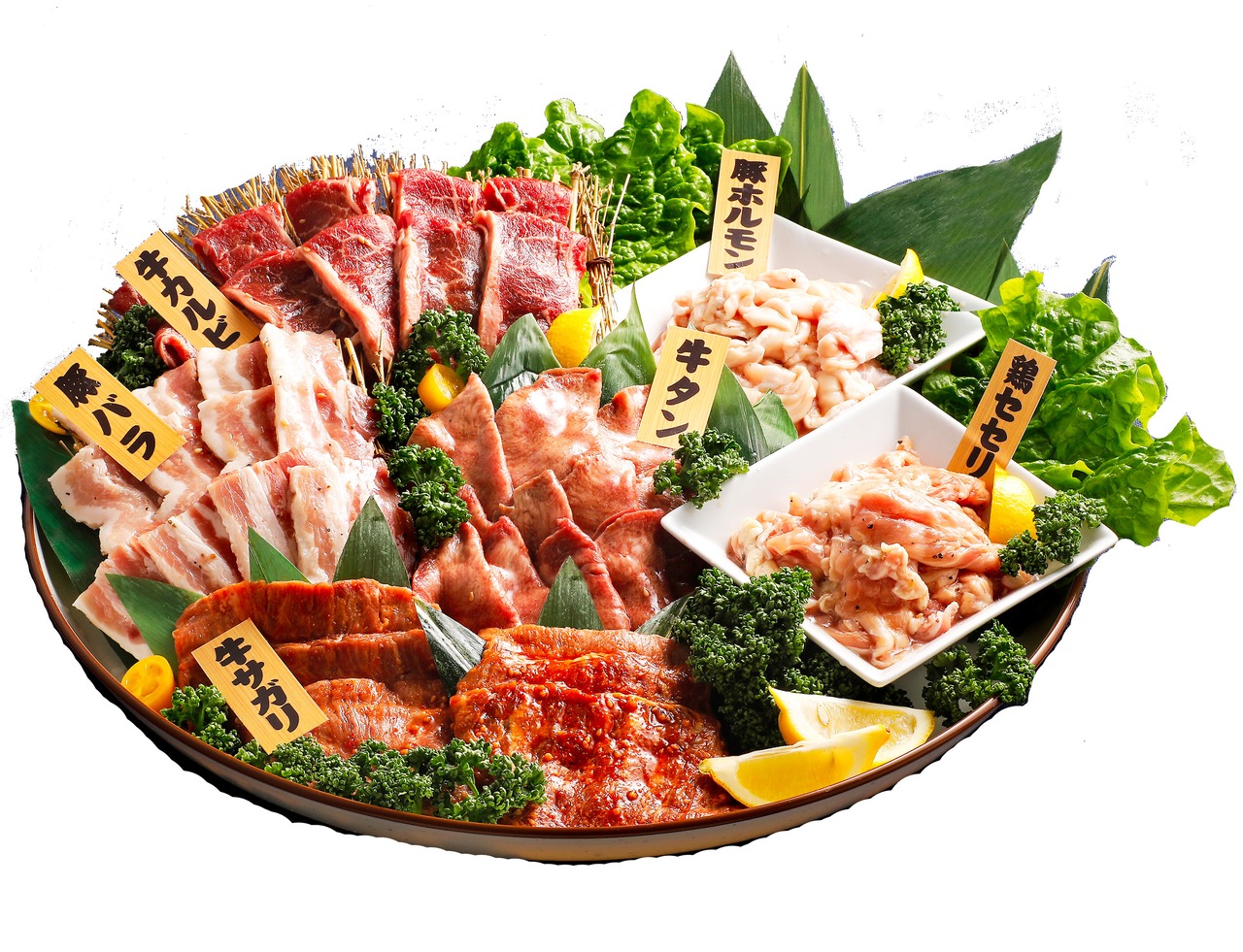 味付牛カルビ1個・味付牛サガリ1個・塩味鶏セセリ1個・塩味豚ホルモン1個・塩味牛タン1個・塩味豚バラ1個・醤油たれ1個・塩味たれ1個