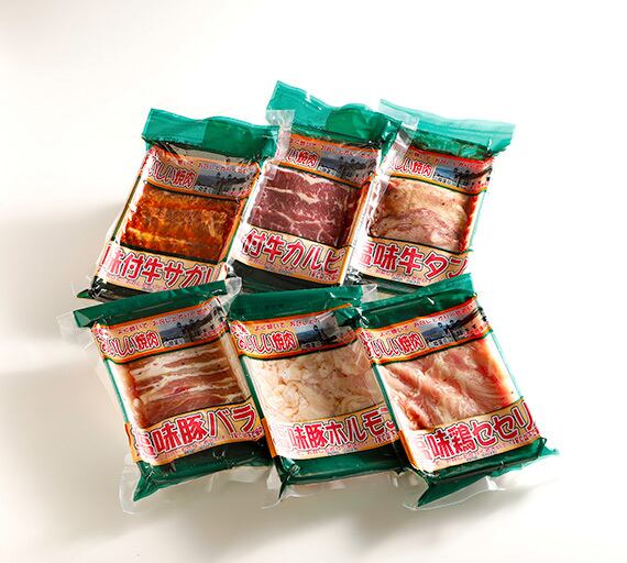 自家製味付牛カルビ 牛肉(アメリカ産)、醤油、砂糖、食塩、食用油脂、 にんにく、しょうが、ごま、香辛料/調味料(アミノ 酸等)、(一部に小麦、ごま、大豆を含む)自家製味付牛サガリ 牛肉(豪州産)、醤油、砂糖、食塩、コチュジャン調味料、 乾燥ガーリック、にんにく、増粘剤、ごま、ビーフエキス、 マスタードシード、唐辛子、赤ピーマン、黒胡椒、 植物油脂/調味料(アミノ酸等)、pH調整剤、カラメル色素、 紅麹色素、酸味料、カロチノイド色素、(一部に小麦、ごま、 大豆を含む)自家製塩味鶏セセリ 鶏肉(アメリカ産)、発酵調味料、葱、水飴、食塩、 レモン果汁、香辛料、ごま、柚子、植物油脂/増粘剤(加工 澱粉、キサンタン)、調味料(アミノ酸等)、酸化防止剤 (ビタミンC)(一部に小麦、ごま、大豆を含む)自家製塩味豚ホルモン 豚直腸(アメリカ産)、発酵調味料、葱、水飴、食塩、 レモン果汁、香辛料、ごま、柚子、植物油脂/増粘剤(加工 澱粉、キサンタン)、調味料(アミノ酸等)、酸化防止剤 (ビタミンC)(一部に小麦、ごま、大豆を含む) 自家製塩味牛タン 牛タン(豪州産)、発酵調味料、葱、水飴、食塩、 レモン果汁、香辛料、ごま、柚子、植物油脂/増粘剤(加工 澱粉、キサンタン)、調味料(アミノ酸等)、酸化防止剤 (ビタミンC)(一部に小麦、ごま、大豆を含む)